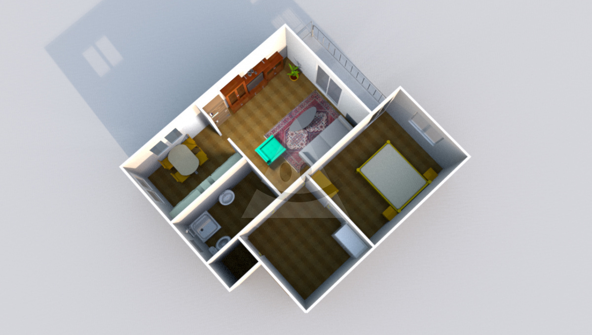 Dispozične pozostáva z predsiene s technickou miestnosťou, priestrannej obývacej izby prepojenej s kuchyňou, spálne a kúpeľne so sprchovým kútom a vaňou a geberitovým WC.
